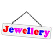 Traditional enamel plaque with text in red, green, blue and purple on a white background,