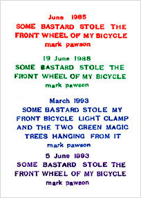 BICYCLE WHEEL THEFT COMMEMORATIVE POSTCARD 1994 Rubberstampped by hand, available in several colour combinations.