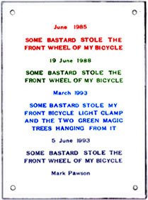 BICYCLE WHEEL THEFT Commemorative Enamel Plaque Mark Pawson/workfortheeyetodo 1995. You've seen the postcards, now buy the plaque!
