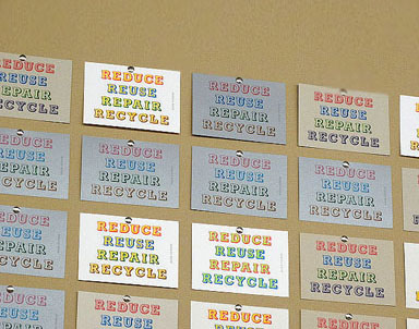 via screenprint and photocopy. Examples of works include Reduce Reuse